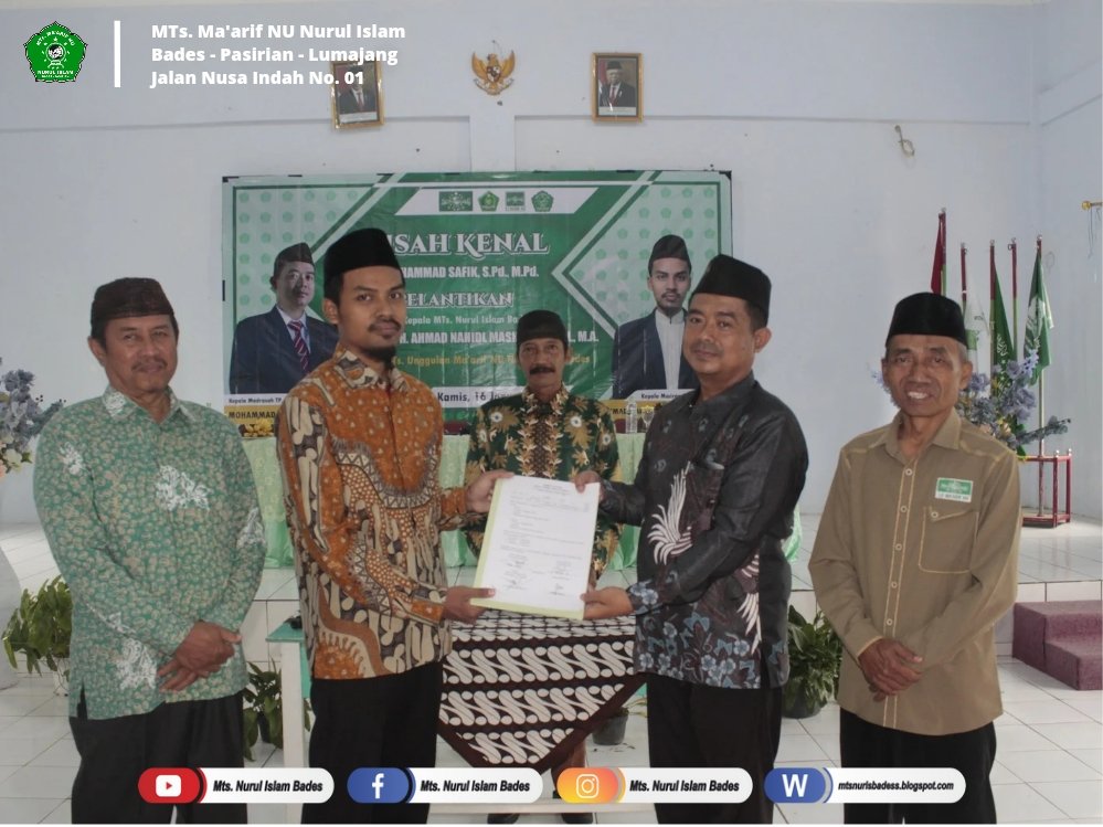 Pasirian - Pengurus BP3MNU Nurul Islam Bades menggelar Pisah kenal Dr. Mohammad Safik, S.Pd., M.Pd. dan Pelantikan H. Achmad Nahidl Mashury, S.Pd.I., M.A. sebagai Kepala Madrasah Tsanawiyah Ma'arif NU Nurul Islam Bades. Kegiatan ini dilaksanakan di Aula Madrasah Tsanawiyah Ma'arif NU Nurul Islam bades yang diikuti oleh seluruh ustad/ustadzah, Kepala Madrasah MTs. Se-kecamatan Pasirian, kepala Paud-MA Nuril islam bades, dan pengurus BP3MNU Nurul Islam Bades. Kamis, (16/01/2024)