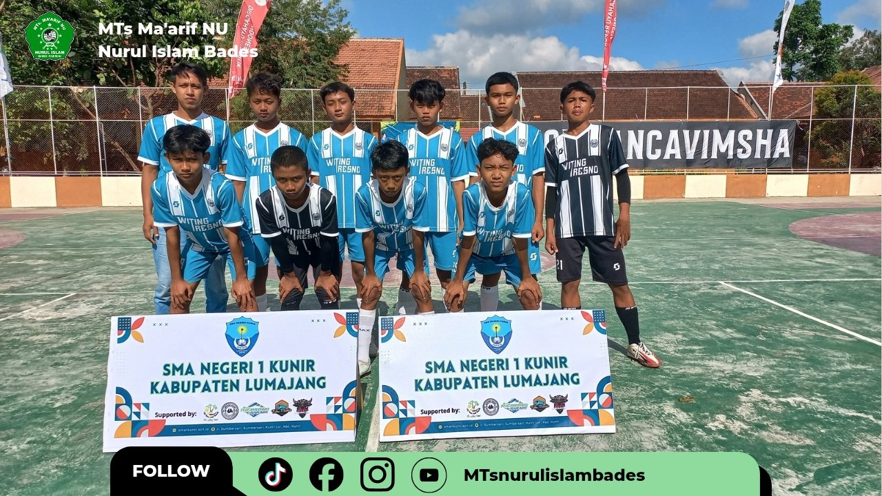 Lumajang, 23 September 2025 — Tim futsal MTs Ma’arif NU Nurul Islam Bades berhasil meraih juara dalam ajang Turnamen Futsal Antar SMP/MTs yang diselenggarakan oleh SMAN 1 Kunir dalam rangka memperingati HUT ke-22. Pertandingan berlangsung di Lapangan Futsal SMAN 1 Kunir dengan atmosfer penuh semangat sportivitas.